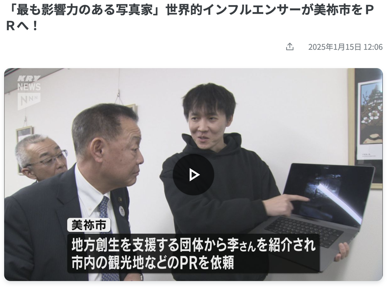 中国SNS「Weibo」で460万人以上のフォロワーを持つ世界的写真家・インフルエンサーKelvin李氏が、秋芳洞や秋吉台、レトロなバス停など市内の象徴的スポットを取材・撮影し、市長への表敬訪問も実施。制作したビジュアルコンテンツは中国語圏で大きな反響を呼び、多数の“いいね”やコメントを獲得しました。